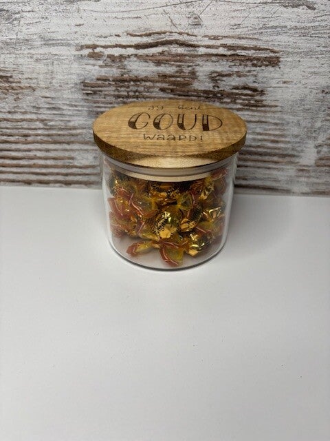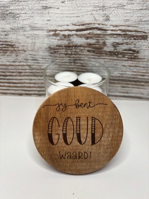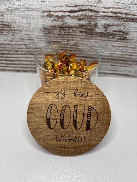 Glazen pot met tekst "je bent goud waard"
